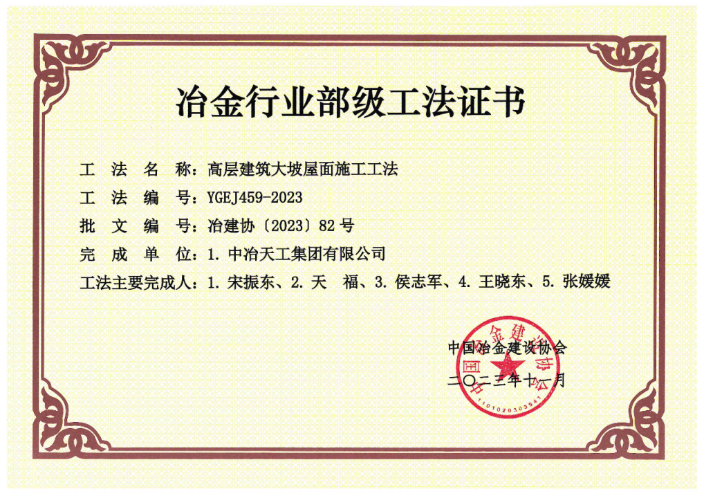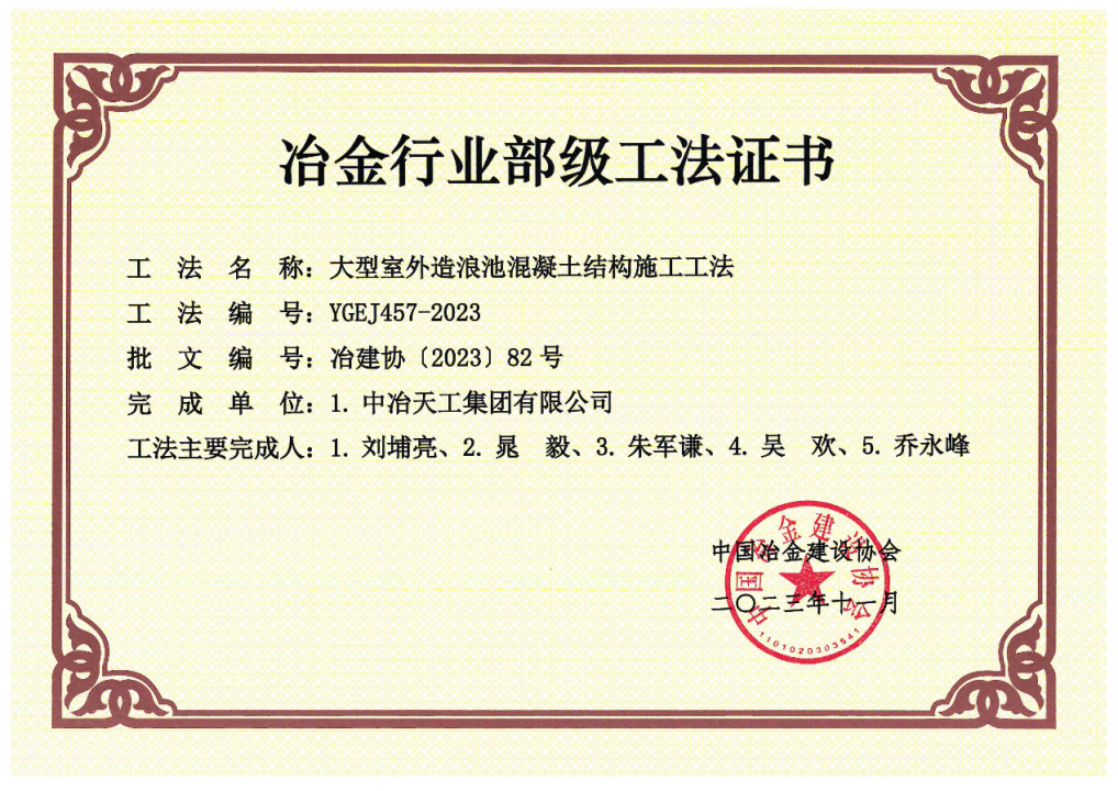 獲評工法《大型室外造浪池混凝土結(jié)構(gòu)施工工法》借助公司滄州文化旅游城項目實施過程而總結(jié)提煉形成一種大型室外造浪池混凝土結(jié)構(gòu)施工技術(shù),解決了施工過程中異形結(jié)構(gòu)模架支設(shè)困難、大體積混凝土水化熱釋放不完全、多層大底板內(nèi)預(yù)埋給水管上浮、大底板弧形表面標(biāo)高控制誤差過大等難題;工法《高層建筑大坡屋面施工工法》以滄州濱海童世界項目為依托,通過優(yōu)化項目大坡屋面施工措施方案,設(shè)計便捷的施工操作平臺,不僅提高坡屋面的施工效率,降低成本,更有效保障施工人員的安全。