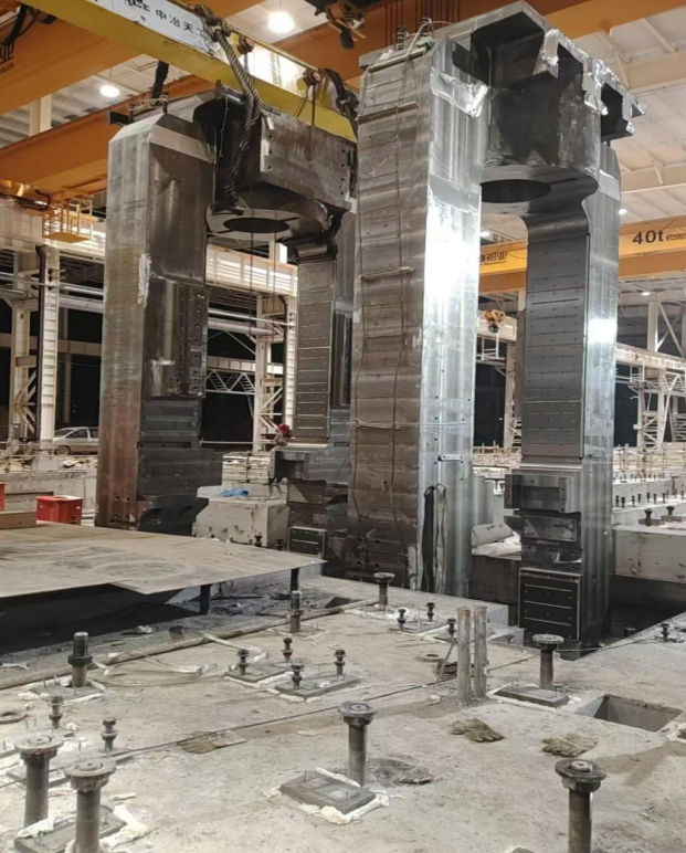自牌坊運抵施工現(xiàn)場以來,項目全體參建人員晝夜奮戰(zhàn)、高效協(xié)同,卸車、清洗、定位、吊裝等各道工序環(huán)環(huán)相扣、無縫銜接。在專業(yè)技術(shù)團隊的精準操控下,兩臺行車同步發(fā)力、平穩(wěn)起吊,經(jīng)過數(shù)小時的緊張作業(yè),R2粗軋機牌坊精準落位,實現(xiàn)一次吊裝圓滿成功。