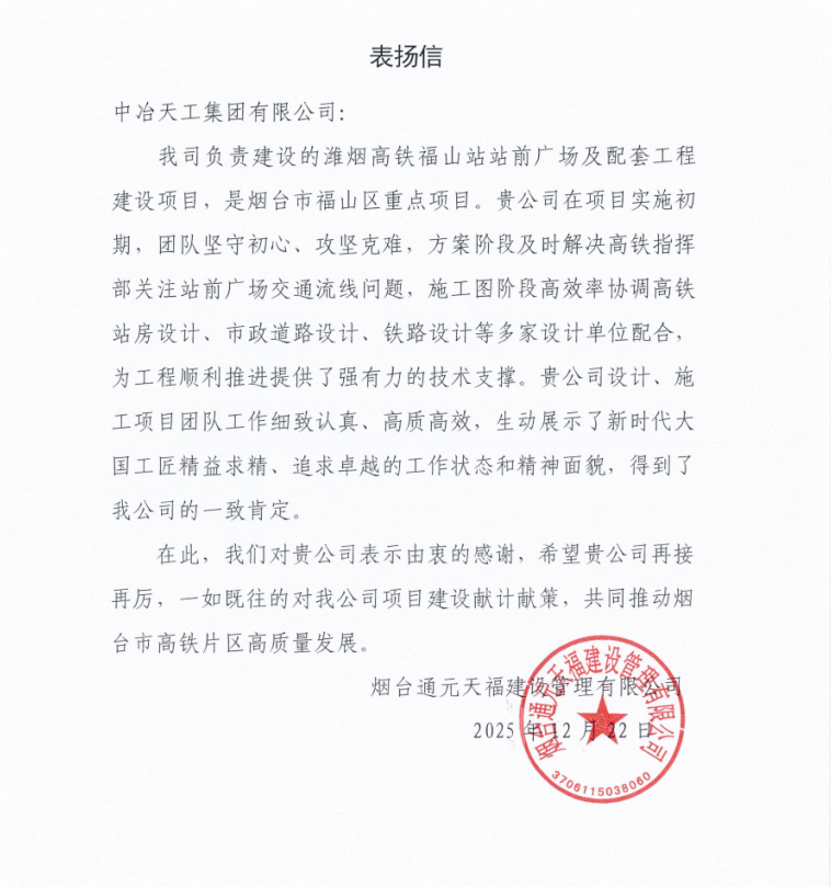 近日,工程技術(shù)總院濰煙高鐵福山站站前廣場(chǎng)及配套工程設(shè)計(jì)項(xiàng)目,收到業(yè)主單位煙臺(tái)通元天福建設(shè)管理有限公司致中冶天工的表?yè)P(yáng)信。信中,業(yè)主單位對(duì)中冶天工設(shè)計(jì)和施工團(tuán)隊(duì)展現(xiàn)出的高效協(xié)作能力及精益求精的優(yōu)質(zhì)服務(wù)給予高度贊譽(yù),對(duì)團(tuán)隊(duì)在項(xiàng)目推進(jìn)過(guò)程中攻克難題、保障進(jìn)度的付出致以誠(chéng)摯感謝。