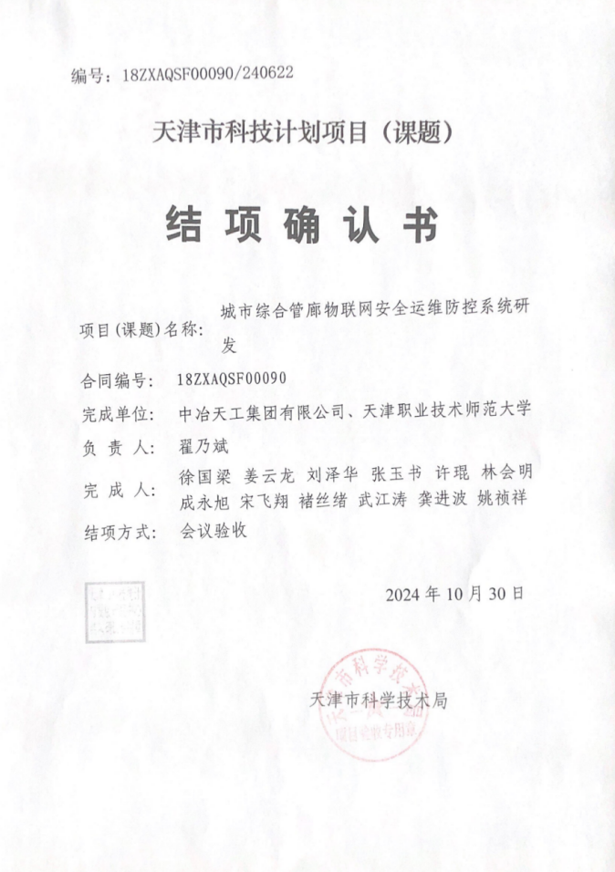 近日,由中冶天工承擔的天津市科技計劃項目《城市綜合管廊物聯(lián)網(wǎng)安全運維防控系統(tǒng)研發(fā)》通過結項驗收。該項目歷經(jīng)數(shù)年艱苦攻關,系統(tǒng)地解決了基于物聯(lián)網(wǎng)技術的地下綜合管廊及管線在運行使用過程中的風險評估和安全監(jiān)管問題,并取得了一系列重要的科研成果,為推動管廊運維技術領域的進步和產(chǎn)業(yè)發(fā)展作出了重大貢獻。